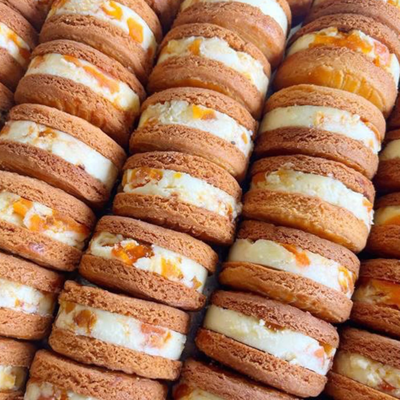 バターとクリームチーズのなめらかなクリームにあんぽ柿をふんだんに使用し、フランス伝統菓子のガレットブルトンヌでサンドしました。